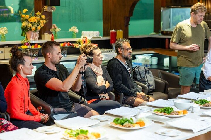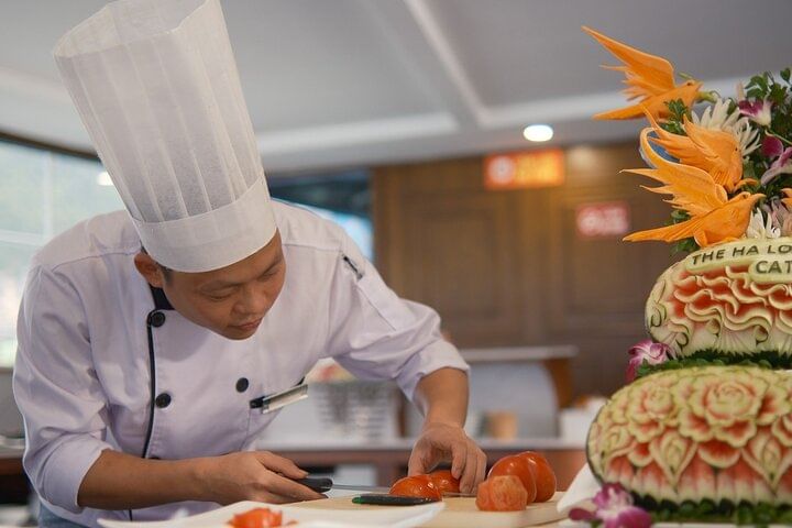 Experience the beauty of Halong and Lan Ha Bay aboard The Halong Catamaran – Luxury Day Cruise with Water Slide, a 5-star experience designed for comfort and adventure. Depart from Tuan Chau Marina and enjoy a scenic cruise through emerald waters and limestone mountains. Discover the Bright and Dark Caves by kayak or bamboo boat, swim at Frog Pond, and have fun with the exclusive onboard water slide. Savor a delicious lunch, join a Vietnamese cooking class, and relax with tea and cakes during the Sunset Ceremony. This luxury day cruise offers the perfect way to explore Halong Bay in style and comfort, whether you depart from Hanoi or Halong.